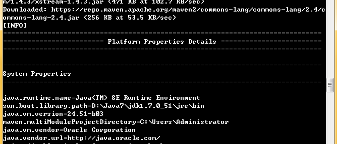 在 DOS 窗口中,运行一条简单命令:mvn help:system。该命令可以让 Maven 自动下载 maven-help-plugin 到本地仓库如图。