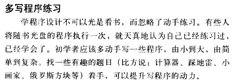 多写程序练习。在这一点上自己也做的太少了,在学校的时候只是按时上课,下课了很少动手写代码,结果现在敲代码时,不知道怎么开始,很是纠结。以后记得自己一定要多敲代码,从简单代码开始,逐渐提高自己的写代码的能力。记住下面这几句话。