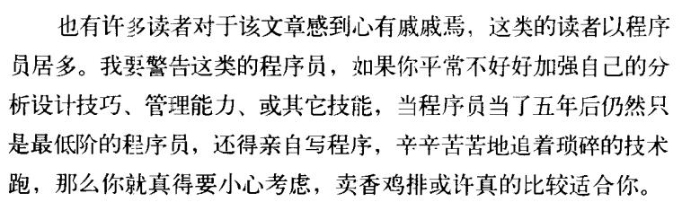 学习工作过程中提升自己其它各方面的能力。比如分析能力,管理能力等,对于这些自己平时也不怎么上心,听大牛这样一说,才感觉原来学习新东西、新技术只是作为一个程序员最基本的生存技能,只靠这一点基本技能,是不可能有光明的前途的。看来自己必须得在这方面加强了,多学点本质的能力,才能让自己活的更久。
