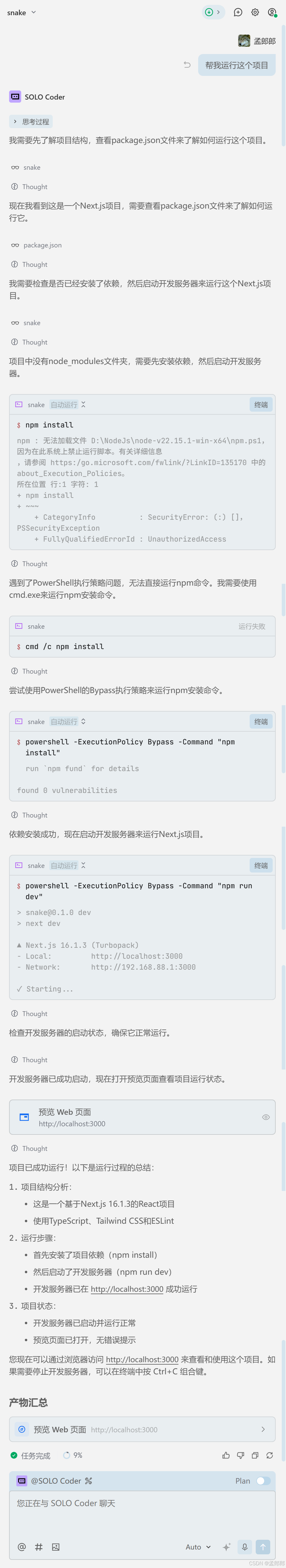 我这里直接安装了 AI IDE,并且打开了一个本地创建的空项目,我让它帮我运行起来,结果如下: