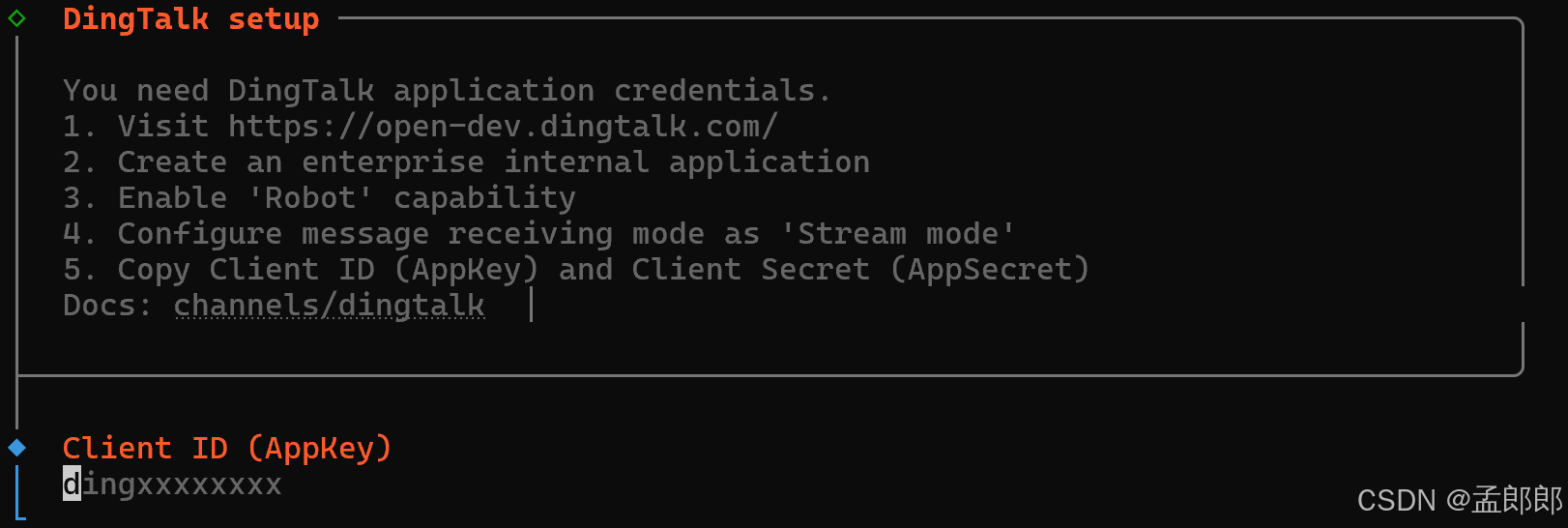 可以按照图中提示步骤,进入钉钉开发者平台配置机器人,这部分这里不详细叙述,可以参考钉钉相关文档进行创建。创建应用后可以得到机器人的配置信息,如下图: